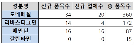 신규 허가를 받은 업체 수는 도네페질 20개사, 메만틴 16개사, 리바스티그민 4개사였다.