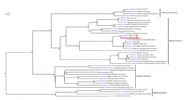 아마도 우리가 신종 코로나 바이러스에 대해서 가장 알고 싶은 것은 첫번째는 “이 병이 치료가 가능할까”이고 두번째는 아마도 “이 바이러스는 무엇이냐, 얘는 어디에서 시작되었냐”일 것입니다. 이번 연구는 두번째 알고 싶어하는 이 바이러스의 기원에 대한 연구입니다. 이미 알려진 생명체에 대해서도 그 기원을 알고 싶어합니다. 사춘기에 우리는 항상 되뇌지요 “나는 무엇인가, 어디에서 왔나”. 하물며 세상에 없었던 질병이 튀어나오니 이것이 어디에서 시작되었는지가 궁금한 것은 당연합니다. 어떤 존재가 어디에 있는지를 확인하는 가장 좋은 방법이 이 존재가 어디에 소속될 수 있는지 분류하는 것입니다. 생물학에서 분류학은 "생물을 분류(classify)하는 이론과 실제"입니다. 즉 원래 분류학이란 생물의 공유 형질의 분석을 통하여 분류군들로 묶고 이들을 다시 종, 속, 과 등의 소분류해 나가는 것입니다. 그런데 단순한 분류를 넘어서고 나면 이런 생각이 들 수가 있습니다. A라고 분류해서 A인 것은 알겠는데 A는 무엇이냐는 생물의 정체성에 대해서 고민하게 됩니다. 즉 분류 단계의 가장 낮은 종에서 역까지, 종 또는 그 상위 분류군에 대해서 서로 어떠한 위치를 가지는가를 판단하여야 합니다. 이를 하기 위해서는 결국 진화적 계통적인 고려를 해야 합니다. 이를 계통 분류학이라고 합니다. 말을 쉽지만 정체성을 고민하는 학문이기 때문에 인문적, 철학적 논쟁도 심심치 않게 벌어집니다. 과거에는 계통 분류학이 다윈이 시도하였듯 형질을 기반으로 이루어지는 경우가 많았습니다. 하지만 최근에는 분자 생물학의 발달로 형질보다는 이 형질의 원인이 되는 유전자 분석을 통하여 많이 연구되고 있습니다. 유전자 분석을 하고 이를 다른 주변의 알려진 종의 유전자와 비교 분석함으로써 그 유명한 계통수가 만들어 집니다. 그리고 그 계통수에 현재 있는 이 종을 끼워 넣으면 이 종의 정체성을 알 수가 있는 것이지요. 위 그림은 이 연구에서 분석 후 만든 계통수 입니다.