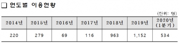 서비스를 받은 인원은 2014년 220명, 2015년 279명, 2016년 69명, 2017년 116명, 2018년 963명, 2019년 1,152명이었다. 올해는 1분기까지 534명이 이용했다.