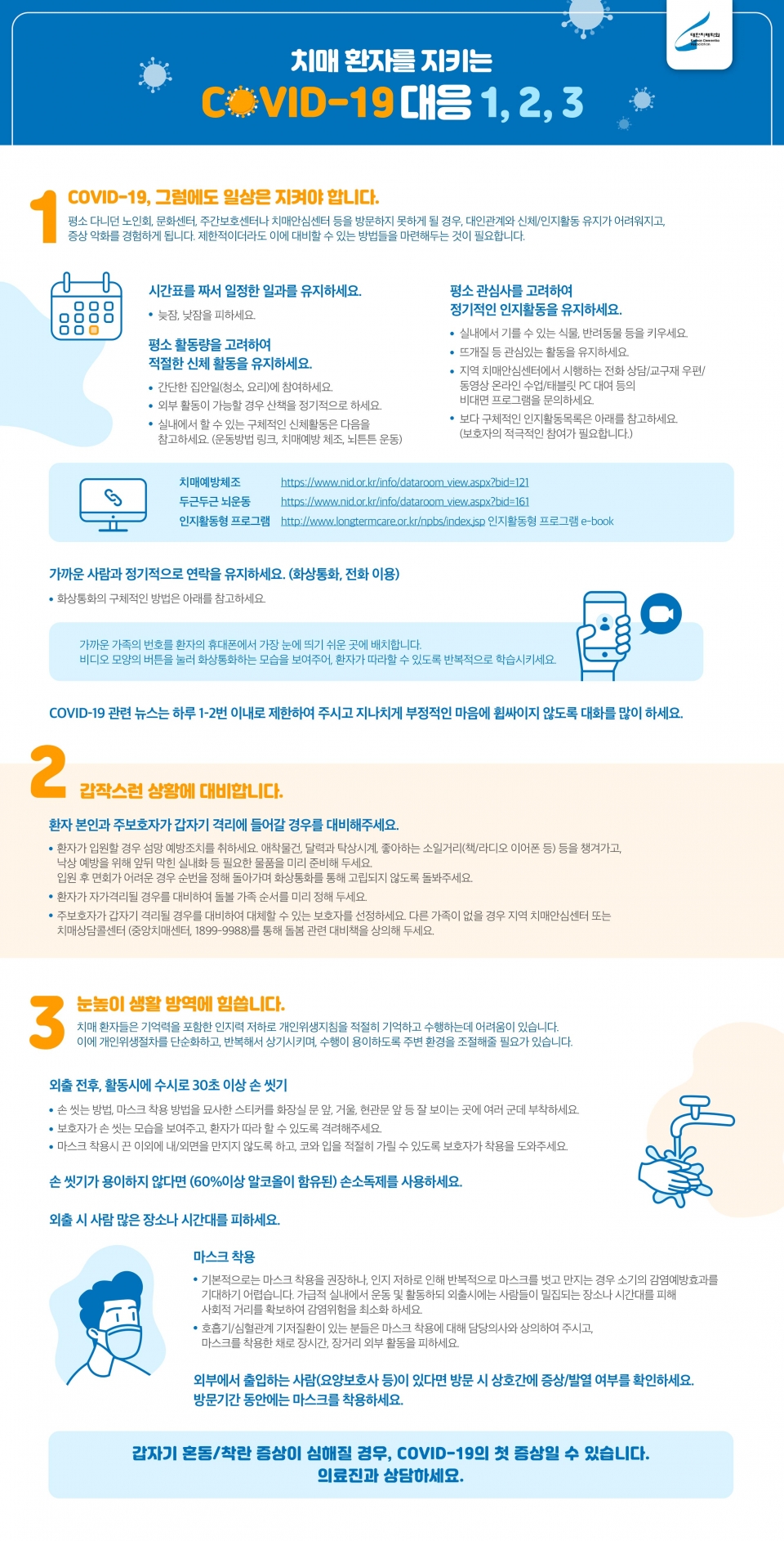 이에 치매학회는 치매 환자와 보호자가 어렵지 않게 생활 속에서 지킬 수 있는 방역 지침을 통해 활동 수칙과 코로나로 인한 갑작스러운 위기 상황 등을 고려해 지침을 발표했다.