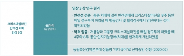 인지기능 개선 약효는 5mg/kg 또는 10mg/kg 크리스데살라진을 투여한 반려견에서 투약 개시 4주와 8주에 모두 유의적으로 나타났으며, 크리스데살라진의 투약과 관련한 부작용은 발견되지 않았다.