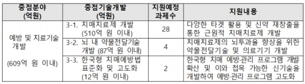국비 지원 규모는 ▲치매 원인규명 및 발병기전 연구 451억원 ▲예측 및 진단기술 개발 508억원 ▲예방 및 치료기술 개발 609억원 등이다.