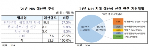 미국에서는 NIA 예산으로 치매 연구보조금을 지원할 뿐 아니라 2015년부터 별도 예산을 국립보건원(National Institute of Health, NIH)에 배정해 지속적으로 새로운 연구를 진행하고 있다. 2021년 NIA와 NIH의 치매 예산은 각각 32억3,000만달러(한화 3조8,330억), 25억6,000만달러(3조)에 이른다.
