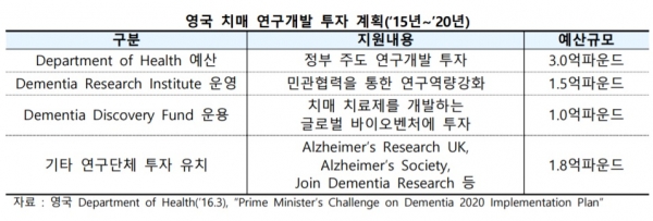 영국은 2012년 치매 대응 국가계획을 발표한 이후 2016년에 관련 정책을 개정해 장기계획을 수립했다. 영국은 치매환자를 위한 최적의 환경을 마련하고, 2020년까지 치매 연구개발 대표 국가로 발전하는 것을 목표로 하고 있다.