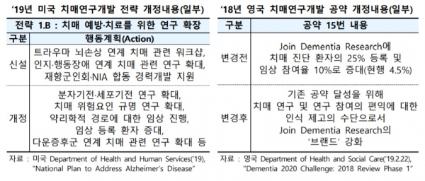 KDB미래전략연구소 산업기술리서치센터 박재은·노경환 연구원은 보고서를 통해 미국·영국의 치매 연구개발사업과 비교를 통해 정책의 발전 방향을 제안했다.