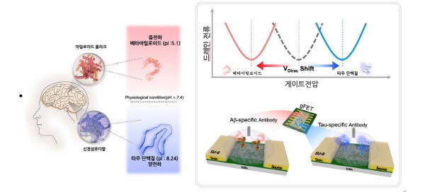 연구팀은 알츠하이머병의 주요 원인 물질인 베타아밀로이드와 타우 단백질이 체액의 생리학적 환경(산도 pH 7.4)에 따라 서로 다른 표면 전하 특성을 가진다는 점에 착안하여 두 생체물질이 구별되는 검출 신호를 내는 그래핀 기반 전계효과트랜지스터 다중 검출 플랫폼을 개발했다.
