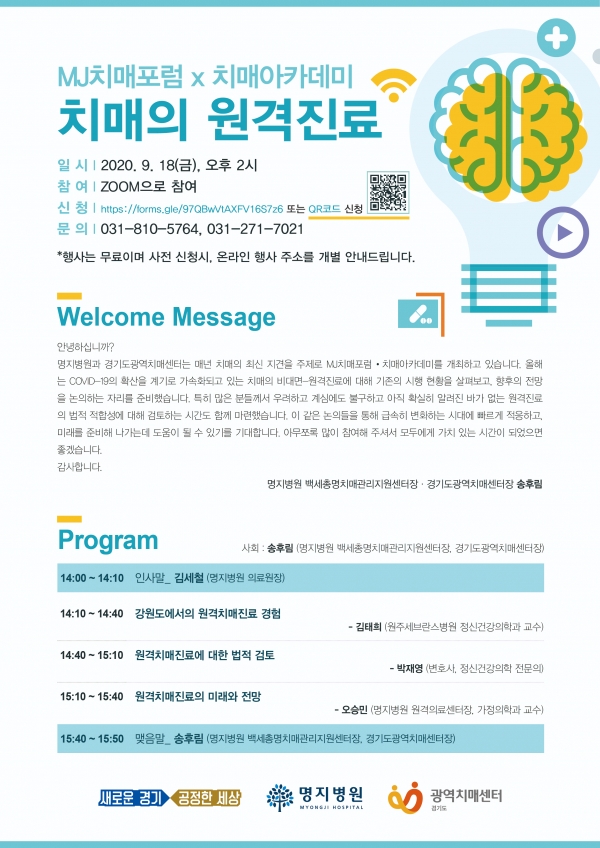 명지병원 백세총명치매관리지원센터와 경기도광역치매센터가 주관하는 MJ치매포럼 & 치매아카데미는 이날 오후 2시부터 화상회의 플랫폼 ‘줌(ZOOM)’을 이용한 온라인으로 진행된다.