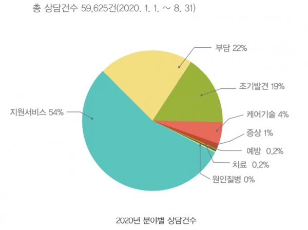 이 중 지원서비스에 대한 상담이 54%(3만2,053건)로 가장 많았으며, 부담 22%(1만3,087건), 조기발견 19%(1만1,219건), 케어기술 4%(2,620건) 순이었다.