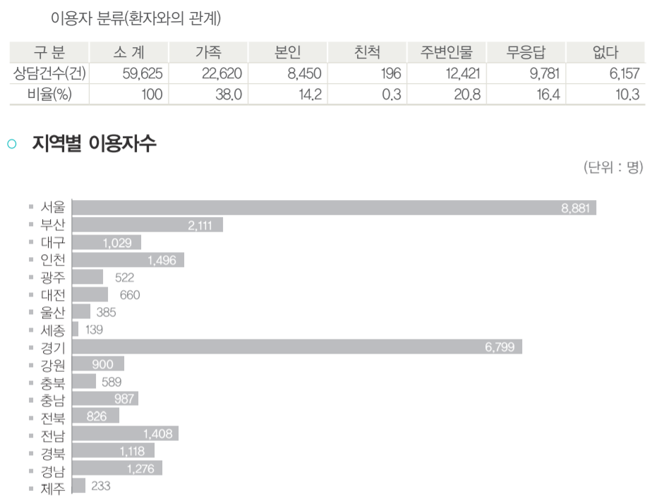 콜센터 이용자는 가족이 2만2,620명으로 38%를 차지했으며, 주변 인물 20.8%(1만2,421명), 본인 14.2%(8,450명) 순으로 많았다.