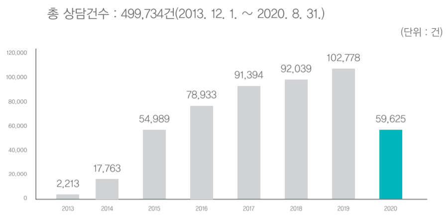 연도별 이용 건수는 2015년 5만4,989건, 2016년 7만8,933건, 2017년 9만1,394건, 2018년 9만2,039건, 2019년 10만2,778건이었다. 2020년은 8월까지 5만9,625건이었다.