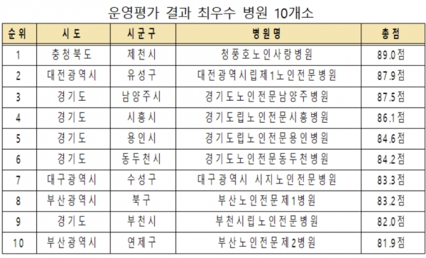 병원별로 보면 청풍호노인사랑병원이 89점을 획득해 32개 병원 중 가장 좋은 평가를 받았고, 그 다음으로는 대전광역시립제1병원(87.9점), 경기도노인전문남양주병원(87.5점) 순이었다.