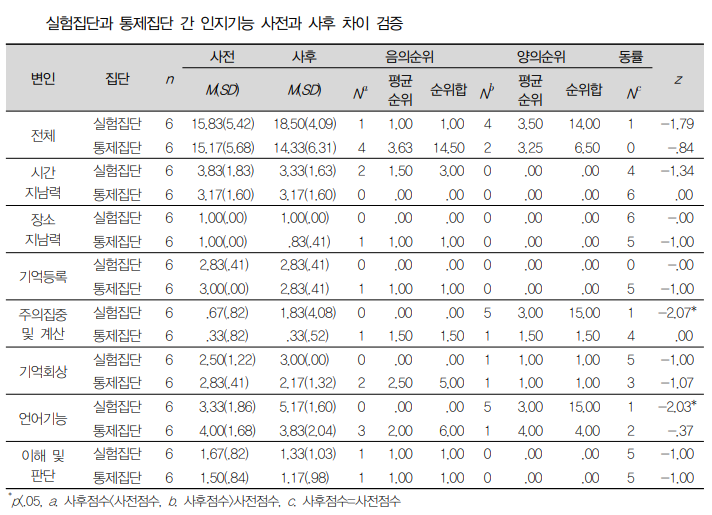 실험 집단의 인지기능 척도는 사전 점수 평균 15.83에서 사후 점수 평균 18.50으로 사전보다 사후점수가 증가했으나 통계적으로 유의하지 않았다(z=-1.79, p>.01).