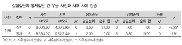 통제집단은 사전 점수 평균 25.67에서 사후 점수 평균 22.83으로 점수가 오히려 감소했고 유의한 변화가 없었다(z=-.94, n.s.).