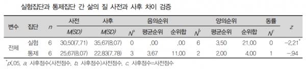 ◆삶의 질= 실험집단의 삶의 질 척도는, 사전 점수 평균 30.50에서 사후 점수 평균 35.67로 점수가 증가해 통계적으로 유의한(z=-2.21, p<.05) 것으로 나타났다.