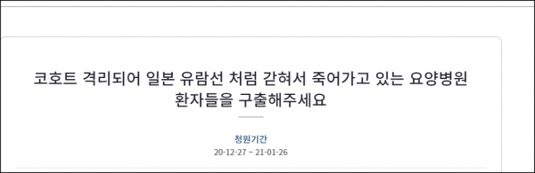 27일 요양병원 의사로 밝힌 청원인은 “코호트 격리되어 일본 유람선처럼 갇혀 죽어가고 있는 요양병원 환자들을 구출해달라”는 제목의 글을 청와대 청원 게시판에 작성했다.