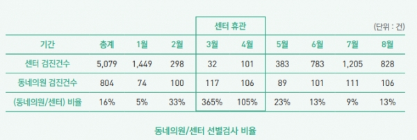 특히 센터가 휴관한 3월과 4월에는 동네의원 검진건수가 센터의 검진건수를 상회했다. 센터는 3월과 4월에 각각 32건과 101건, 동네의원은 117건과 106건을 기록했다.
