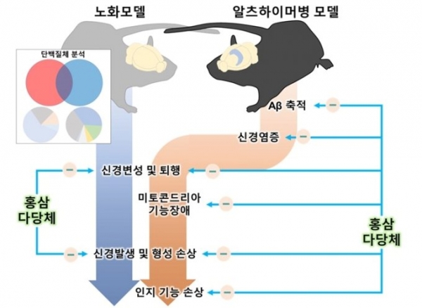 이에 KGC인삼공사와 건양대 부설 치매과학연구소는 노화 및 알츠하이머병 동물모델을 대상으로 홍삼 다당체를 투여한 뒤, 노령 쥐의 뇌에서 단백체 분석 및 다양한 알츠하이머병과 관련된 병리들을 관찰했다.