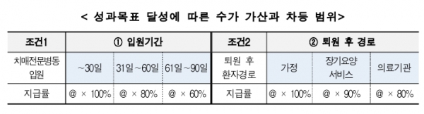 인센티브 범위는 요양병원 의료중도 기본 일당정액수가(인력가산 없음) 수준인 1일 4만5,000원이 입원기간 동안 지급된다. 입원기간과 퇴원 후 경로에 따라 가산율을 차등 적용해 시범사업 대상 환자가 퇴원한 후에 사후적으로 최종 지급된다.