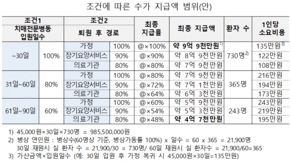 환자가 30일 입원을 하고 가정으로 돌아갈 경우에는 일당 4만5,000원, 90일을 입원한 후 의료기관으로 갈 경우에는 일당 2만1,600원을 지급하게 되는 셈이다.