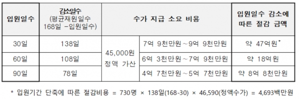 중증 치매환자의 평균 입원기간은 168일이다. 60병상의 병원이 입원한 모든 환자의 입원기간을 30일로 단축할 경우 최대 47억원의 재정이 덜 소요된다. 138일의 입원 기간을 단축한 데 따른 것이다.