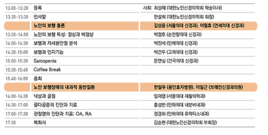 이어 박정호 순천향의대 신경과 교수의 노인의 보행 특성:정상과 비정상, 박진세 인제의대 신경과 교수 보행과 자세불안정 분석, 박건후 고대의대 신경과 교수의 보행과 인지기능 등도 진행된다.
