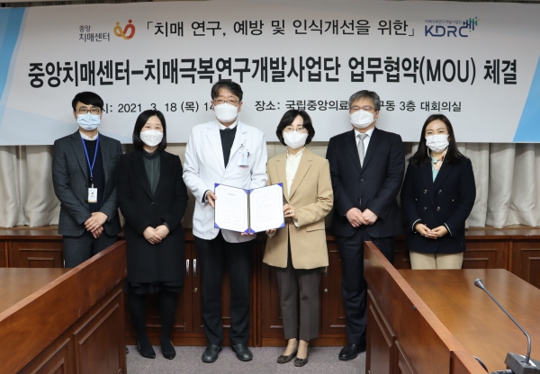 중앙치매센터(국립중앙의료원 위탁운영, 센터장 고임석)와 치매극복연구개발사업단(단장 묵인희)은 18일 치매국가책임제와 치매관리종합계획의 성공적인 이행을 위해 상호간의 협력을 약속하는 업무협약을 체결했다.