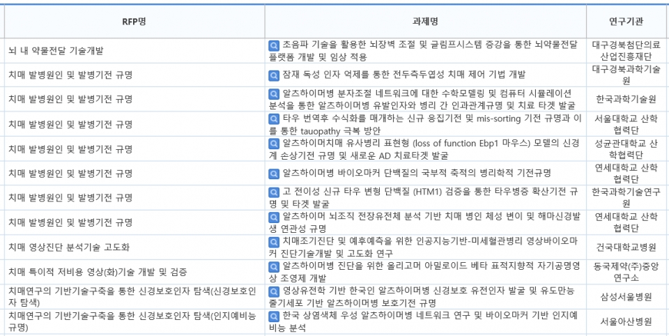 ▲잠재 독성 인자 억제를 통한 전두측두엽성 치매 제어 기법 개발(대구경북과학기술원) ▲알츠하이머병 분자조절 네트워크에 대한 수학모델링 및 컴퓨터 시뮬레이션 분석을 통한 알츠하이머병 유발인자와 병리 간 인과관계규명 및 치료 타겟 발굴 (한국과학기술원) ▲타우 번역후 수식화를 매개하는 신규 응집기전 및 mis-sorting 기전 규명과 이를 통한 tauopathy 극복 방안(서울대학교 산학협력단) ▲알츠하이머치매 유사병리 표현형 (loss of function Ebp1 마우스) 모델의 신경계 손상기전 규명 및 새로운 AD 치료타겟 발굴(성균관대학교 산학협력단) ▲알츠하이머병 바이오마커 단백질의 국부적 축적의 병리학적 기전규명(연세대학교 산학협력단) ▲고 전이성 신규 타우 변형 단백질 (HTM1) 검증을 통한 타우병증 확산기전 규명 및 타겟 발굴(한국과학기술연구원) ▲알츠하이머 뇌조직 전장유전체 분석 기반 치매 병인 체성 변이 및 해마신경발생 연관성 규명(연세대학교 산학협력단) 등이다.