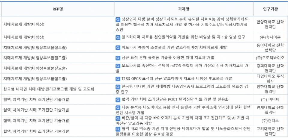 ▲혈액 기반 치매 조기진단용 POCT 면역진단 키트 개발 및 실용화(비비비) ▲다중 분석용 나노바이오 융합 센서 플랫폼 기반 루이소체 인지장애 질환 혈액 진단 시스템 개발(연세대학교 산학협력단) ▲비즙/혈액 내 다중 바이오마커 분석 기반의 치매 조기진단키트 및 AI 기반 치매진단 알고리즘 개발(캔티스) ▲혈액 내의 엑소좀 기반 치매 진단용 바이오마커 발굴 및 나노플라즈모닉 진단 플랫폼을 이용한 임상 유효성 검증(고려대학교 산학협력단) 등이다.