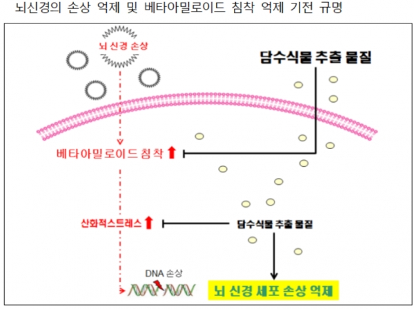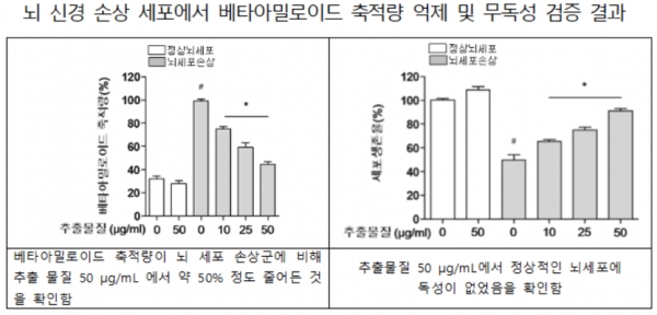 연구진은 이 추출물질(50μg/mL)을 뇌 신경이 손상된 실험쥐의 뇌세포에 처리한 결과, 베타아밀로이드 축적량이 약 50% 정도 줄어든 것을 확인했다.