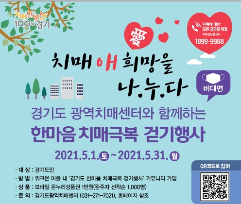 경기도와 경기도광역치매센터는 오는 5월 1일부터 5월 31일까지 치매 예방 및 인식개선을 위한 2021년 경기도 한마음 치매극복 걷기행사 '치매 애(愛) 희망을 나누다'를 코로나 예방을 위해 모바일 어플리케이션 ‘워크온’을 활용해 비대면 방식으로 개최한다고 7일 밝혔다.