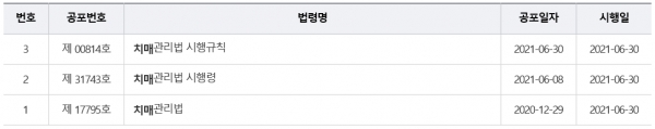 치매관리법은 지난해 12월 29일, 시행령은 6월 8일, 시행규칙은 6월 30일 공포됐으며, 시행일은 6월 30일로 동일하다.