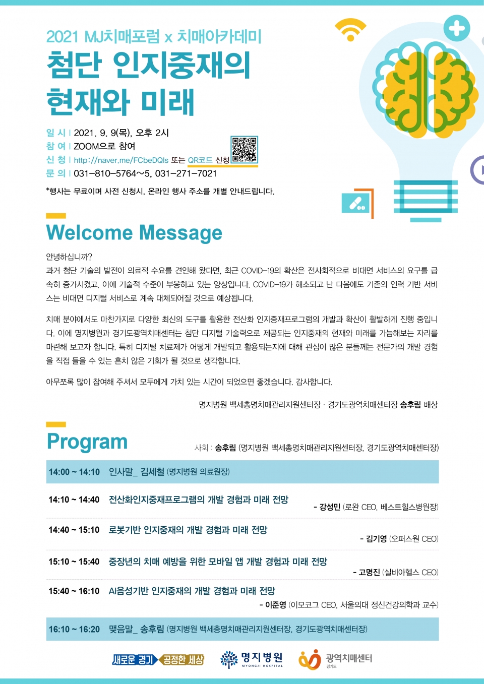 오는 9월 9일 오후2시 경기도광역치매센터와 명지병원에서 '첨단인지중재의 현재와 미래' 온라인 포럼이 개최된다.