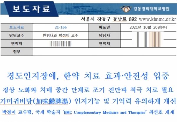 강동경희대학교병원 한방내과 박정미 교수 연구팀(이하 ‘연구팀’)은 지난 10월 20일 ‘경도인지장애, 한약 치료 효과·안전성 입증’이라는 제목의 보도자료를 배포했다.