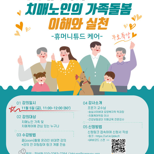 오는 11월 5일 오전11시부터 '치매노인의 가족돌봄 이해와 실천 : 휴머니튜드 케어' 무료 특강이 Zoom을 통해 온라인 개최된다.