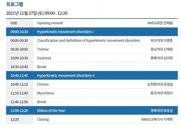 대한파킨슨병 및 이상운동질환학회(KMDS)가 오는 27일 오전9시부터 온라인 동계보수교육을 진행한다.