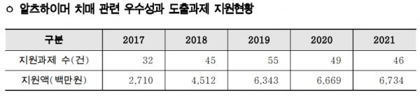 자료에 따르면, 알츠하이머 치매와 관련한 기초연구사업 지원액은 꾸준한 증가세를 보였다. 반면 연구지원 과제 수는 2019년 정점을 찍다가 이후부터 소폭 줄었다.