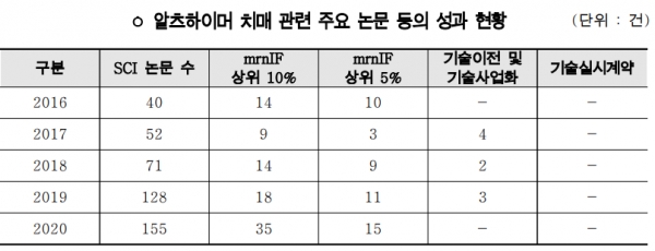 기초연구에 대한 지원 확대에 따라 치매 관련 주요 논문 등재 등에서도 성과를 나타내고 있다.