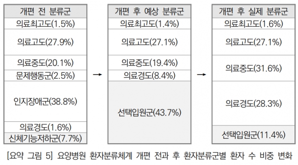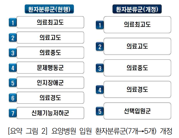 ◆요양병원 입원환자 분류체계 개편= 2019년 11월 1일부터 요양병원 입원환자 분류체계는 7개에서 5개로 개편됐다. 개편 전 요양병원 입원환자 분류체계는 의학적 입원 필요성, 돌봄 필요성 두 가지 다른 분류기준이 혼재돼 있었으나, 개편 후 입원 필요성에 따른 단일 기준만 적용됐다. 이에 문제행동군과 인지장애군이 삭제되고 선택입원군이 신설됐다.