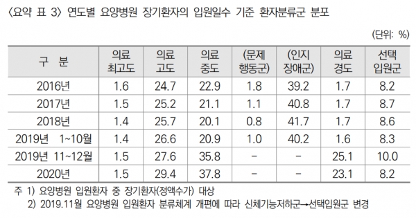 요양병원에 입소해 있는 환자의 장기입원을 막기 위해 개편됐던 '요양병원 입원환자 환자분류체계'가 당초 예상했던 정책 효과가 전혀 없는 것으로 나타났다.