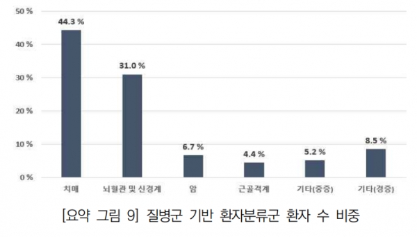 국내 요양병원 입원환자를 질병군에 따라 분류하면, 5개 질병군으로 나뉜다. 치매 분류군은 전체 환자의 44.3%로 가장 많은 비중을 차지했으며, 뇌혈관 및 신경계 분류군 31.0%, 암 6.7%, 근골격계 4.4%, 기타 분류군 13.6%(중증 5.2%, 경증 8.5%)였다.