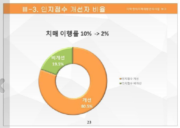 이어 "본 연구소는 2016년 사업대상자 200명 중 최대 128명(64%)은 경도인지장애가 아닐 가능성이 높은 것으로 예측하고 있다"며 "이처럼 학문적 근거가 결여된 부실한 사업에서 치매이행률을 80% 감소시킨다는 결과가 나온다는 것은 상상할 수도 없다"고 꼬집었다.