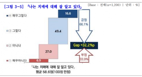 '나는 치매에 대해 잘 알고 있다'는 질의에는 긍정 응답 비중이 66.1%로 부정 응답 비중 33.9%보다 월등히 높게 나왔다. '치매환자를 돌보는 것은 보람 있는 일이다'라는 질의에 긍정 응답 비중은 69.1%로 부정 응답 비중 30.9%보다 높았다.