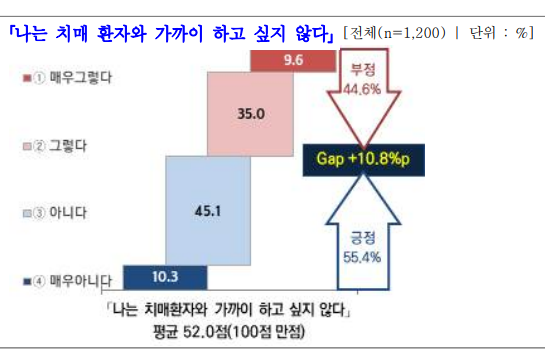 '나는 치매환자가 가까이 하고 싶지 않다'라는 항목에는 그렇다는 응답과 아니다라는 응답이 각각 44.6%와 55.4%였다. '치매환자의 문제 행동도 충분히 조절이 가능하다'라는 질의에는 그렇다와 아니라라는 응답 비중이 각각 50.8%와 49.2%로 비슷한 수치가 나왔다.