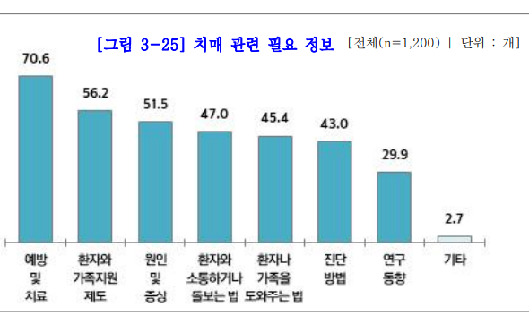 치매 관련 필요 정보를 조사한 결과, 예방 및 치료라는 응답이 70.6%로 가장 많고, 환자와 가족지원 제도(56.2%), 원인 및 증상(51.5%), 환자와 소통하거나 돌보는 법(47.0%), 환자나 가족을 도와주는 법(45.4%), 진단 방법(43.0%) 등의 순이었다.