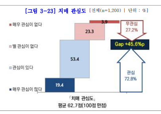 치매에 대한 관심도를 조사한 결과, 관심 비중은 72.8%, 무관심은 27.2%였다.
