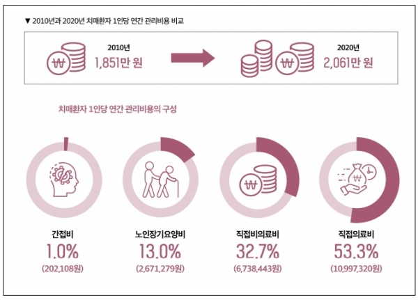 2010년 치매환자 1인당 연간 관리비용은 1,851만원이었으나, 10년이 흐른 2020년에는 2,061만원으로 추정됐다. 1년 전인 2019년 1인당 관리비용 2,072만원보다 11만원이 줄었다. 이는 치매환자에 대한 보장성이 강화된 영향으로 분석된다.