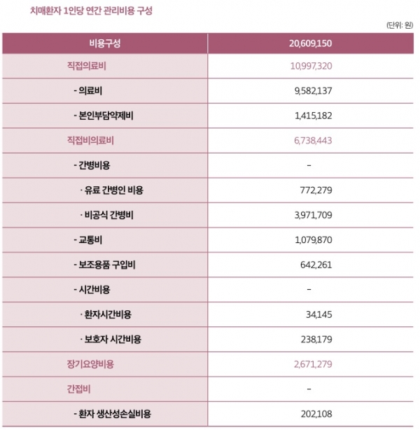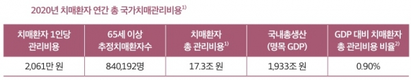 2020년 연간 치매관리비용은 17조3,000억원인 것으로 나타났으며, 이를 1인당으로 환산했을 때 2,061만원이었다.
