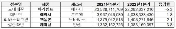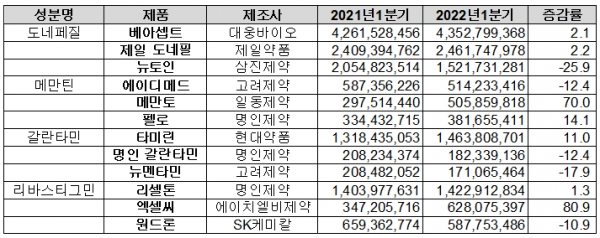 치매약 시장에서 가장 큰 비중을 차지하는 아리셉트(성분명 도네페질)의 지난 1분기 누적 처방액은 222억8,263만원으로 전년 동기 대비 5.3% 줄었다. 처방액이 소폭 감소하기는 했으나 오리지널 시장 1위는 굳건히 유지했다.