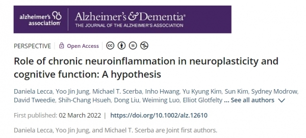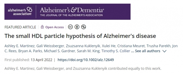 <논문> Martinez AE, Weissberger G, Kuklenyik Z, He X, Meuret C, Parekh T, Rees JC, Parks BA, Gardner MS, King SM, Collier TS, Harrington MG, Sweeney MD, Wang X, Zlokovic BV, Joe E, Nation DA, Schneider LS, Chui HC, Barr JR, Han SD, Krauss RM, Yassine HN. The small HDL particle hypothesis of Alzheimer's disease. Alzheimers Dement. 2022 Apr 13. doi: 10.1002/alz.12649.