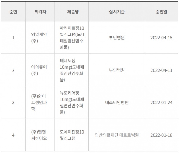 일반적으로 생동성시험은 제네릭의 신규 허가를 목적으로 하고 있으나 올해 승인받은 업체는 모두 도네페질 제네릭을 이미 보유한 업체였다.